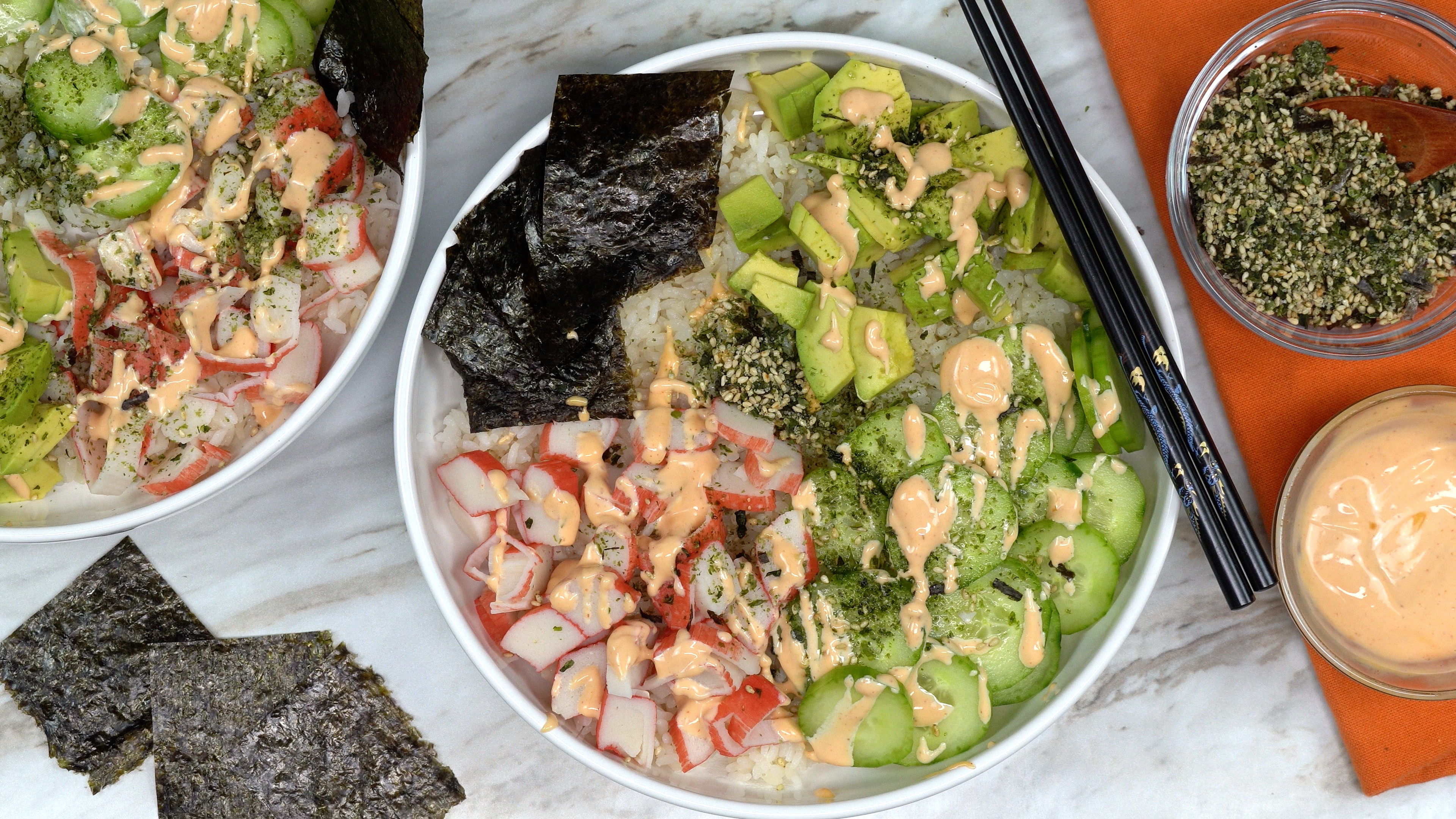 - Assemble: rice on the bottom of the bowl. Add cucumbers, avocado, imitation crab, furikake (Japanese rice seasoning), mini seaweed sheets, drizzle the sauce on top.